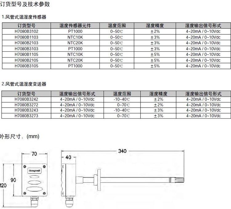 Honeywell霍尼韦尔H7080B3273/H7080B3243/H7080B2105温湿度传感器/变送器