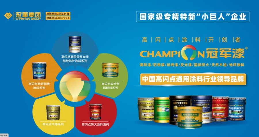 江苏冠军科技集团股份有限公司主要生产冠军防火涂料,鲸海防火涂料,冠军膨胀型防火涂料,鲸海膨胀型防火涂料,冠军非膨胀型防火涂料,鲸海非膨胀型防火涂料,冠军厚型防火涂料,鲸海厚型防火涂料,冠军薄型防火涂料,鲸海薄型防火涂料,冠军超薄型钢结构防火涂料,鲸海超薄型钢结构防火涂料。环氧富锌底漆,环氧云铁中间漆,聚氨酯面漆,环氧煤沥青漆等工业防腐油漆和防火涂料。
