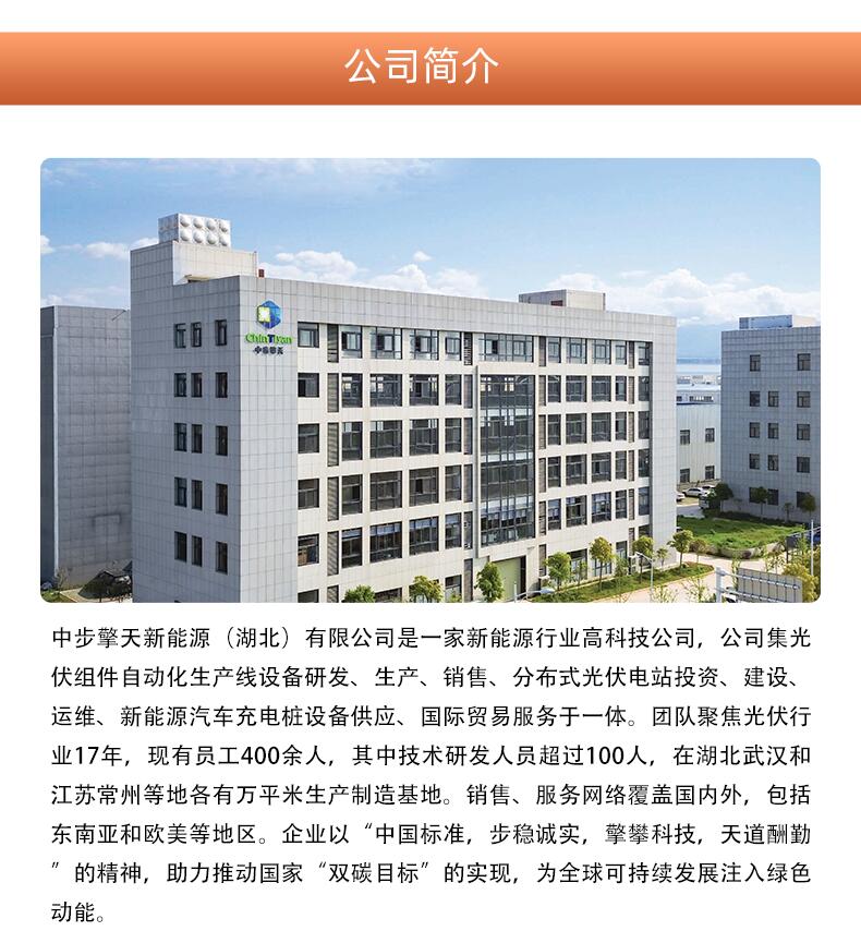 进入公司首页中步擎天新能源公司团队在太阳能光伏行业工业自动化集成行业钻研多年。10-500MW全自动光伏组件生产线交钥匙解决方案Turnkey solution for 10-500MW automatic photovoltaic module production line公司秉持“中国标准,步稳诚实,擎攀科技,天道酬勤”的企业精神。