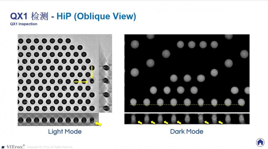 Vitrox伟特V810能够检测出多种缺陷,包括短路、断路、元件缺失、不沾锡、元件侧贴、元件立件、翘脚、锡球、 空洞 、少锡、钽电容极性贴反、多余焊锡。此外,它还能检测出生产过程中常见的一些最隐蔽的焊接头缺陷,例如枕头效应 (head-in-pillow)、封装体堆叠 (PoP)、镀通孔(PTH)和多种类型的连接器接头缺陷,检测性能远远超过市场上的其他AXI设备。